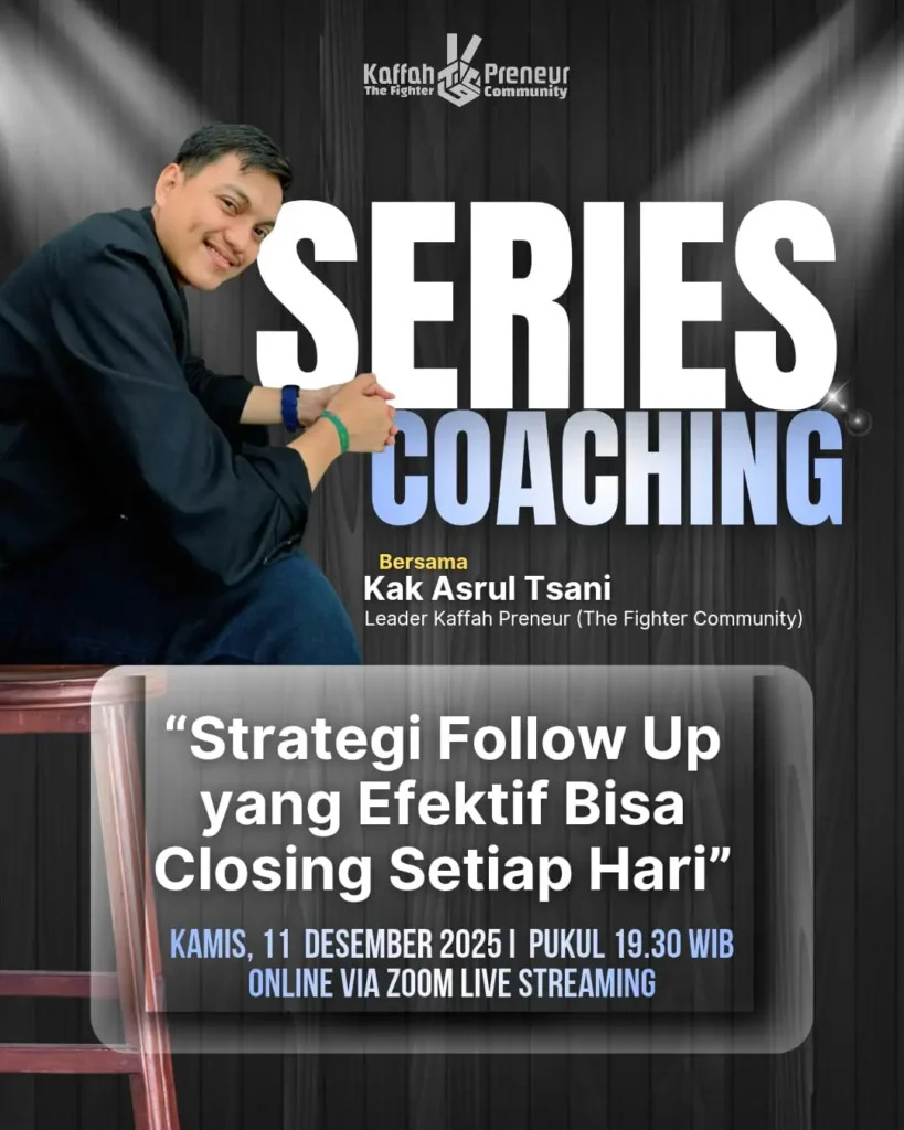 SERIES COACHING dari Kaffah Preneur (The Fighter Community) kembali hadir! Kali ini akan dibawakan oleh Kak Asrul Tsani (Leader Kaffah Preneur) dengan tema: “Strategi Follow Up yang Efektif Bisa Closing Setiap Hari.”Cocok untuk kamu yang ingin meningkatkan hasil penjualan lewat follow up yang lebih terarah, konsisten, dan meyakinkan. 🗓️ Kamis, 11 Desember 2025⏰ Pukul 19.30 […]