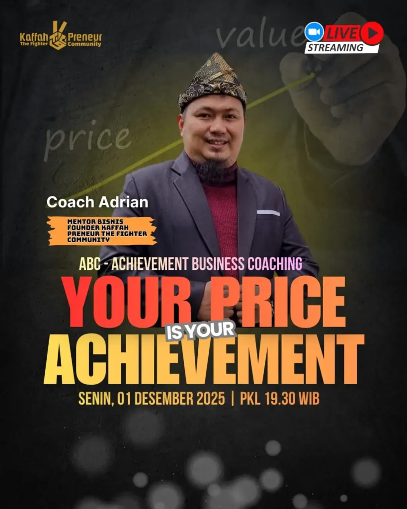 ABC – Achievement Business Coaching bersama Coach Adrian (Mentor Bisnis & Founder Kaffah Preneur – The Fighter Community) hadir dengan tema: “YOUR PRICE IS YOUR ACHIEVEMENT”.Di sesi ini kamu akan belajar memahami nilai (value) diri/produk, membangun mindset harga, dan berani mematok price yang sepadan dengan pencapaianmu. 📅 Senin, 01 Desember 2025⏰ Pukul 19.30 WIB🔴 Live […]